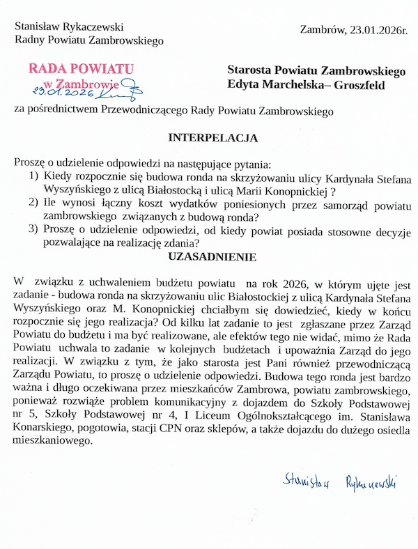 - W związku z uchwaleniem budżetu powiatu na rok 2026, w którym ujęte jest zadanie - budowa ronda na skrzyżowaniu ulic Białostockiej z ulicą Kardynała Stefana Wyszyńskiego oraz M. Konopnickiej chciałbym się dowiedzieć, kiedy w końcu rozpocznie się jego realizacja? Od kilku lat zadanie to jest zgłaszane przez Zarząd Powiatu do budżetu i ma być realizowane, ale efektów tego nie widać, mimo że Rada Powiatu uchwala to zadanie w kolejnych budżetach i upoważnia Zarząd do jego realizacji - czytamy w interpelacji radnego.