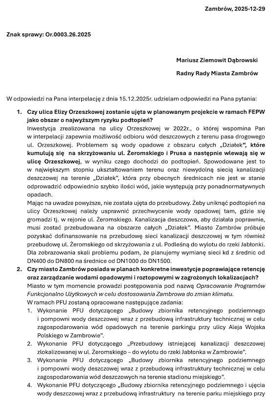 Radny Miasta Zambrów Mariusz Ziemowit Dąbrowski skierował interpelację do burmistrza Kazimierza Dąbrowskiego, która dotyczyła wieloletniego i wciąż nierozwiązanego problemu zalewania budynków i posesji przy ulicy Elizy Orzeszkowej w Zambrowie, gdzie mieszkańcy prywatnych nieruchomości od ponad 30 lat doświadczają skutków intensywnych opadów deszczu i borykają się z problemem cyklicznych zalań wodami opadowymi, która spływa z drogi publicznej.