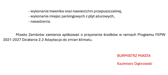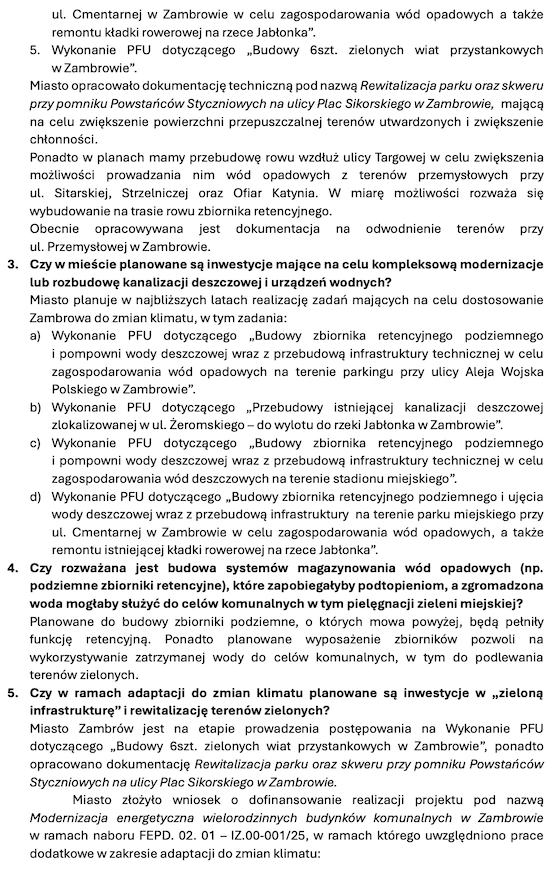 Miasto obecnie prowadzi postępowania pod nazwą Opracowanie Programów Funkcjonalno Użytkowych w celu dostosowania Zambrowa do zmian klimatu. W ramach PFU zostaną opracowane mają być budowy zbiorników retencyjnych podziemnych i pompowni wody deszczowej wraz z przebudową infrastruktury technicznej w celu zagospodarowania wód opadowych na terenie parkingu przy alei Wojska Polskiego w Zambrowie, na terenie stadionu miejskiego, parku miejskiego przy ul. Cmentarnej w Zambrowie, a także przebudowa istniejącej kanalizacji deszczowej przy ul. Żeromskiego – do wylotu do rzeki Jabłonki oraz wykonanie PFU dotyczącego budowy 6 szt. zielonych wiat przystankowych w Zambrowie.