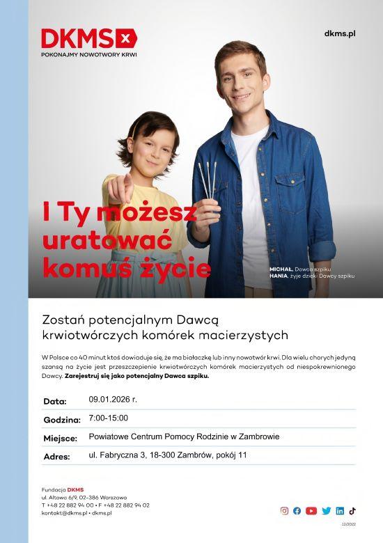 Zapraszamy do udziału w akcji organizowanej przez Fundację DKMS i Powiatowe Centrum Pomocy Rodzinie w Zambrowie. Zgłoś się i zostań dawcą szpiku kostnego!