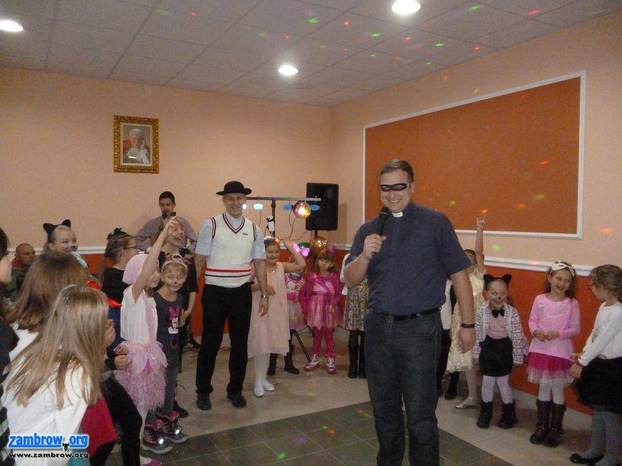 W zabawie uczestniczyło około 100 dzieci z Zambrowa i okolic. Jako że obowiązywał strój balowy, na imprezie nie zabrakło księżniczek, królewiczów, kotków, aniołków, góralek, cyganek i innych przeróżnych ciekawych strojów. Bal rozpoczęto polonezem i co najciekawsze wszyscy potrafili go zatańczyć, a to dzięki ks. Łukaszowi. Po tym wprowadzaniu i przywitaniu zaczęła się zabawa. Dzieci mogły bawić się do znanych im utworów przygotowanych przez pana Piotra i jego syna Szymona. Uczestniczyły w różnorodnych konkurencjach z nagrodami, przygotowanymi przez ks. Roberta. Największym powodzeniem cieszył się konkurs na najpiękniejszy taniec. Zabawy z chustą dały dzieciom mnóstwo radości, a księża okazali się wspaniałymi wodzirejami.