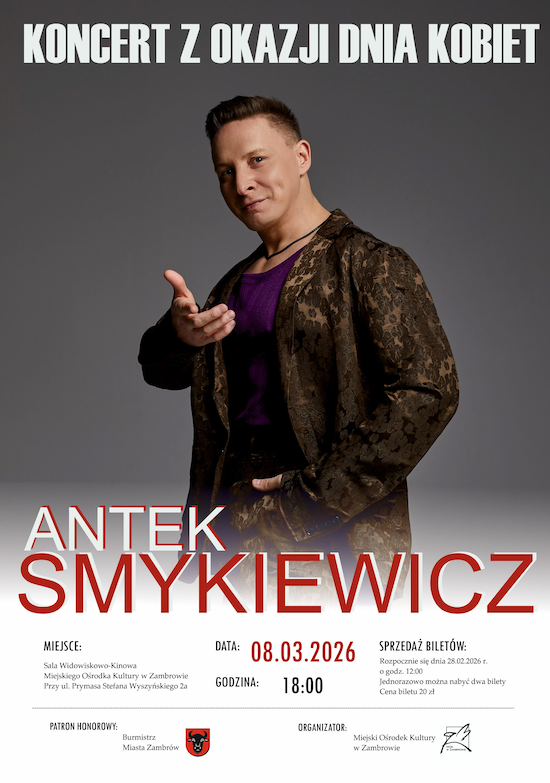 Miejski Ośrodek Kultury w Zambrowie zaprasza na koncert z okazji Dnia Kobiet, który odbędzie się 8 marca 2026 r. Gwiazdą wieczoru będzie popularny polski artysta Antek Smykiewicz. Wydarzenie rozpocznie się o godzinie 18:00 w sali widowiskowo-kinowej MOK przy ulicy Prymasa Stefana Wyszyńskiego 2a. Patronat honorowy nad koncertem objął Burmistrz Miasta Zambrów Kazimierz Dąbrowski.
