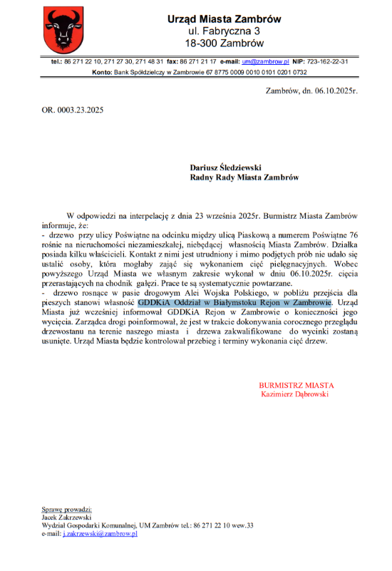 Burmistrz Miasta Zambrów Kazimierz Dąbrowski odpowiedział na interpelację Radnego Miasta Dariusza Śledziewskiego z 23 września w sprawie zwiększenia bezpieczeństwa na terenie miasta. Radny apelował o usunięcie zwisających gałęzi na ulicy Poświątne oraz uschłego drzewa na alei Wojska Polskiego 31 w Zambrowie.