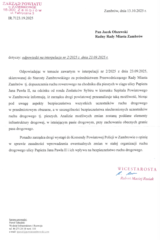 W odpowiedzi na interpelację Wicestarosta Zambrowski Robert Maciej Rosiak poinformował, że zaproponowane przez radnego zmiany zostaną przeanalizowane z uwzględnieniem aspektów bezpieczeństwa wszystkich uczestników ruchu drogowego, a w szczególności bezpieczeństwa niechronionych uczestników ruchu drogowego tj. pieszych. Ponadto zarządca drogi ma wystąpić do Komendy Powiatowej Policji w Zambrowie o opinię w sprawie zasadności wprowadzenia ewentualnych zmian w stałej organizacji ruchu drogowego ulicy Papieża Jana Pawła II i ich wpływu na bezpieczeństwo ruchu drogowego.