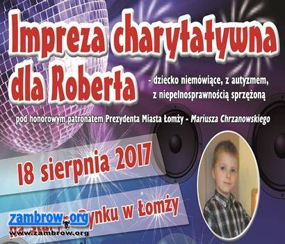 Choć do imprezy charytatywnej dla małego mieszkańca Łomży Roberta Kowalewskiego zostało jeszcze dwa tygodnie (18 sierpnia) to już dziś rodzice dziecka oraz ich przyjaciele zapraszają do udziału w tym wydarzeniu. Akcja organizowana jest przez Fundację Przyjaciół Dzieci „ARIADNA” oraz Dj Lukasa. Honorowy patronat sprawuje Prezydent Miasta Łomży Mariusz Chrzanowski.