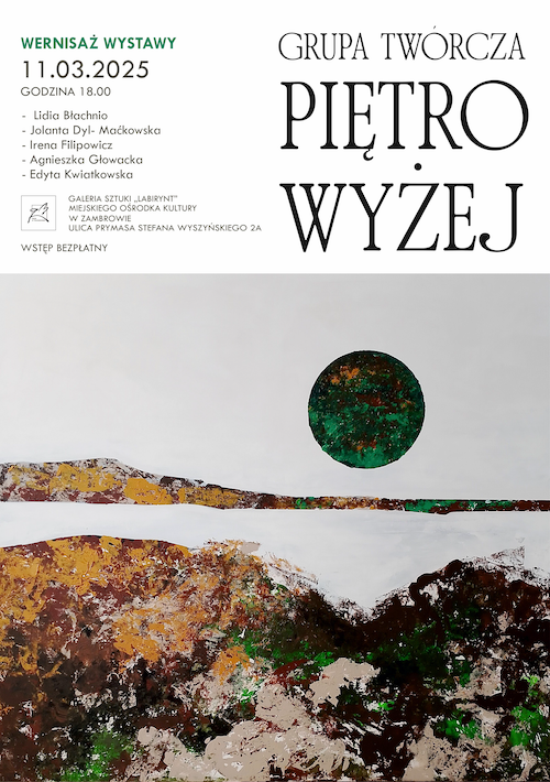 Serdecznie zapraszamy wszystkich miłośników sztuki na wernisaż wystawy Grupy Twórczej Piętro Wyżej, który odbędzie się w Galerii Sztuki „Labirynt" Miejskiego Ośrodka Kultury w Zambrowie w najbliższy wtorek, 11 marca. Początek zaplanowano na godzinę 18:00.