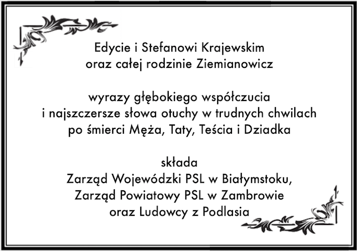 Edycie i Stefanowi Krajewskim oraz całej rodzinie Ziemianowicz wyrazy głębokiego współczucia i najszczersze słowa otuchy w trudnych chwilach po śmierci Męża, Taty, Teścia i Dziadka składa Zarząd Wojewódzki PSL w Białymstoku, Zarząd Powiatowy PSL w Zambrowie oraz Ludowcy z Podlasia.