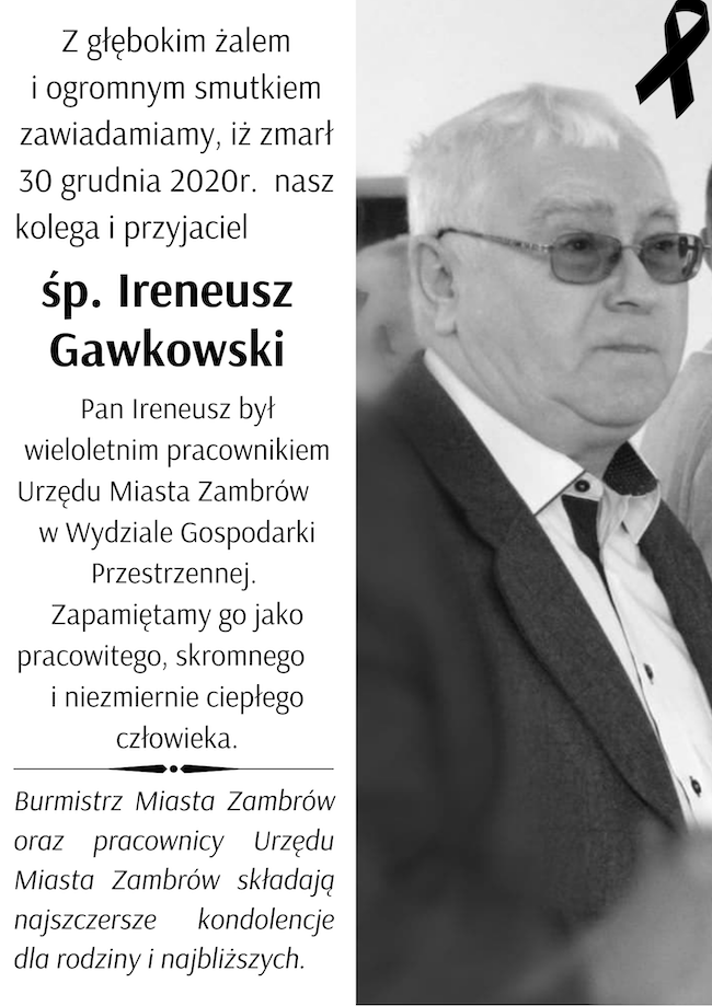 Burmistrz Miasta Zambrów oraz pracownicy Urzędu Miasta Zambrów składają najszczersze kondolencje dla rodziny i najbliższych śp. Ireneusza Gawkowskiego - wieloletniego pracownika Wydziału Gospodarki Przestrzennej w Urzędzie Miasta Zambrów.