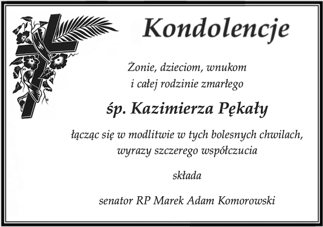 Kondolencje Rodzinie śp. Kazimierza Pękały składa Senator RP Marek Adam Komorowski