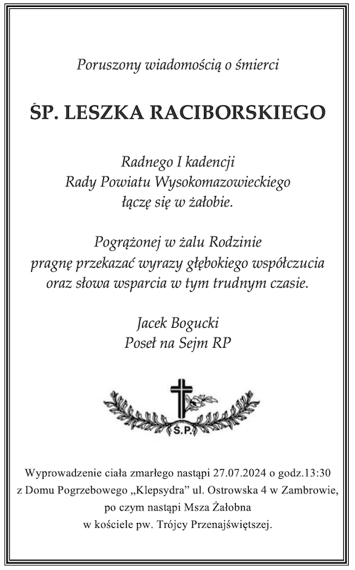 Poruszony wiadomością o śmierci Śp. Leszka Raciborskiego - Radnego I kadencji Rady Powiatu Wysokomazowieckiego łączę się w żałobie.