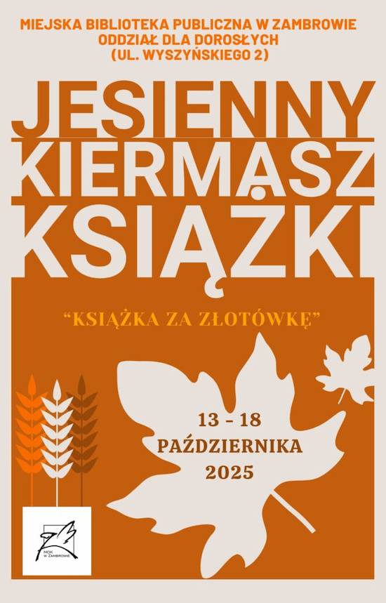 Od poniedziałku, 13 października do soboty, 18 października w Oddziale dla Dorosłych Miejskiej Biblioteki Publicznej w Zambrowie przy ul. Wyszyńskiego 2 odbędzie się Jesienny Kiermasz Książki "Książka za złotówkę".