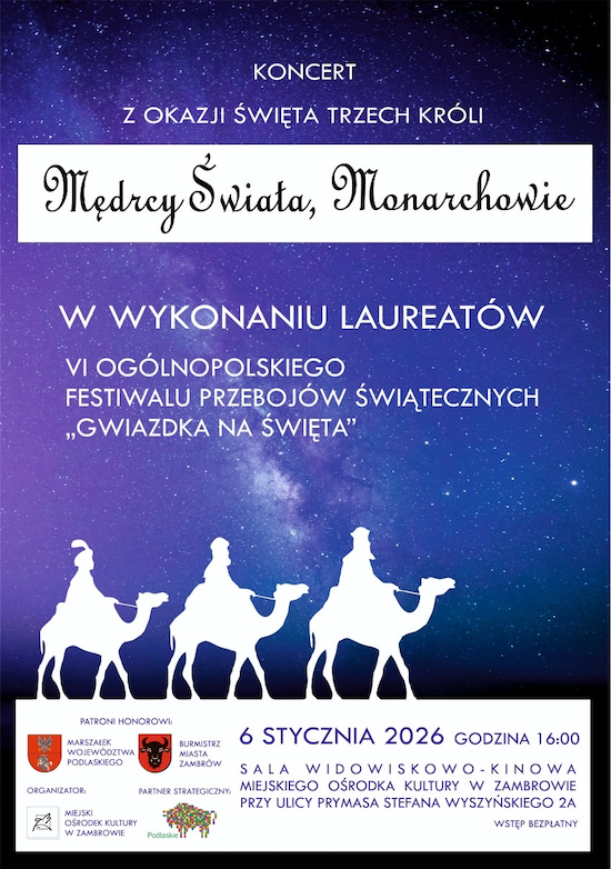 Koncert z okazji Święta Trzech Króli zatytułowany "Mędrcy Świata, Monarchowie" odbędzie się we wtorek, 6 stycznia w sali widowiskowo-kinowej Miejskiego Ośrodka Kultury w Zambrowie.