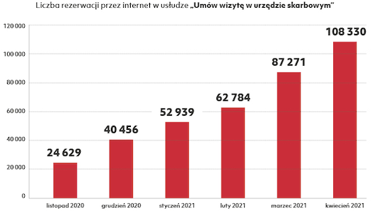 Szybko przybywa rezerwacji za pośrednictwem internetowego formularza, dostępnego na wizyta.podatki.gov.pl. W kwietniu 2021 roku ponad 108 tys. wizyt zostało umówionych internetowo, podczas gdy jeszcze 3 miesiące wcześniej było ich 53 tys.