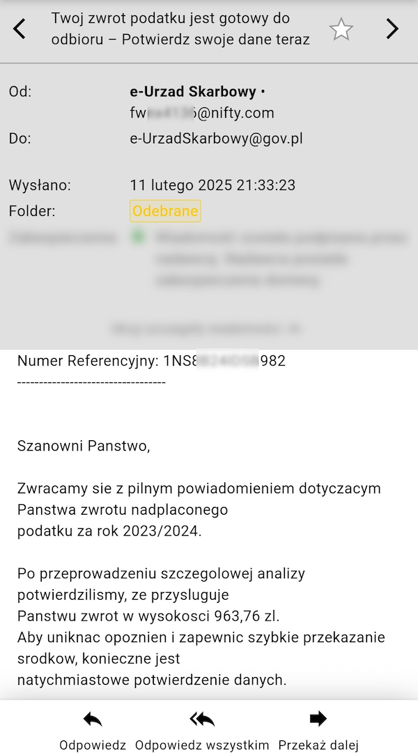 - Szanowni Panstwo, Zwracamy sie z pilnym powiadomieniem dotyczacym Panstwa zwrotu nadplaconego podatku za rok 2023/2024. Po przeprowadzeniu szczegolowej analizy potwierdzilismy, ze przysluguje Panstwu zwrot w wysokosci 963,76 zl. Aby uniknac opoznien i zapewnic szybkie przekazanie srodkow, konieczne jest natychmiastowe potwierdzenie danych - takiej treści wiadomości trafiają na skrzynki mailowe podatników.