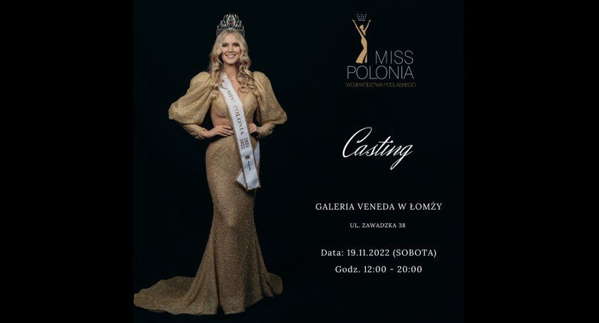 Casting do pierwszej edycji konkursu Miss Polonia 2023 odbędzie się w sobotę, 19 listopada w Łomży, w Galerii Veneda. Wszystkie szczegóły dotyczące udziału w eliminacjach sukcesywnie pojawiają się na oficjalnych profilach konkursu: IG: @misspoloniapodlasia oraz FB: Miss Polonia Województwa Podlaskiego. Na casting za pośrednictwem swojego konta w mediach społecznościowych (IG) zaprasza również pochodząca z Białegostoku Miss Polonia 2021/2022 Krystyna Sokołowska. Kandydatki, które dostaną się do finałowej grupy czeka sporo pracy. Ze wszystkimi działaniami zaplanowanymi przez organizatorów konkursu będą musiały wyrobić się do końca lutego 2023 roku.