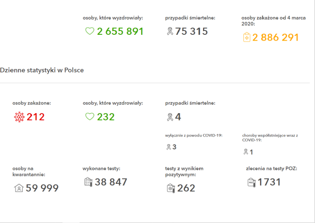 W całej Polsce w ciągu ostatniej doby odnotowano 212 nowych i potwierdzonych przypadków zakażeń koronawirusem SARS-CoV-2 z województw: