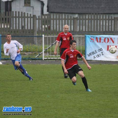 Już po pierwszych minutach spotkania widać było, że drużyna gości przyjechała do Zambrowa powalczyć o jak najlepszy rezultat. Nie przestraszyła się wicelidera rozgrywek III ligi. Goście pierwsze kilka minut atakowali bramkę gospodarzy, jednak z upływem czasu to Olimpia doszła do głosu. W 15 min. spotkania Jakuszewski wykonywał rzut wolny z około 17 m, jego strzał minimalnie minął poprzeczkę. Od tego momentu na boisku widać było oblężenie bramki gości. „Gol” wisiał w powietrzu. Akcja poszła lewą stroną. Piłkę otrzymał Dzienis i plasowanym strzałem, dzięki niepewnej interwencji bramkarza uzyskał prowadzenie w 31 min. dla gospodarzy. Cztery minuty później Olimpia wykonywała rzut rożny. Dzierzgowski główką minimalnie strzelił obok słupka. W 37. min Jastrzębski chciał przelobować golkipera gości lecz piłka była zbyt lekko i została złapana przez bramkarza. Napór Olimpii trwał do końca pierwszej połowy, lecz wynik nie uległ zmianie.