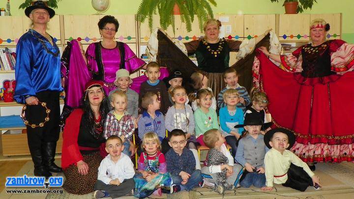 Wielką atrakcją dla przedszkolaków była wizyta trzech cyganek i przystojnego cygana z zambrowskiego Teatru Form Różnych, którzy zaprezentowali dzieciom swoje bogate stroje i tańce w rytm cygańskiej muzyki.