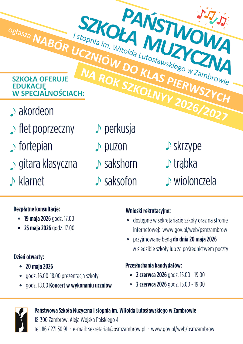 Państwowa Szkoła Muzyczna I stopnia im. Witolda Lutosławskiego w Zambrowie rozpoczęła przyjmowanie wniosków od kandydatów do klas pierwszych na rok szkolny 2026/2027. Dokumenty można składać do 20 maja 2026 r.