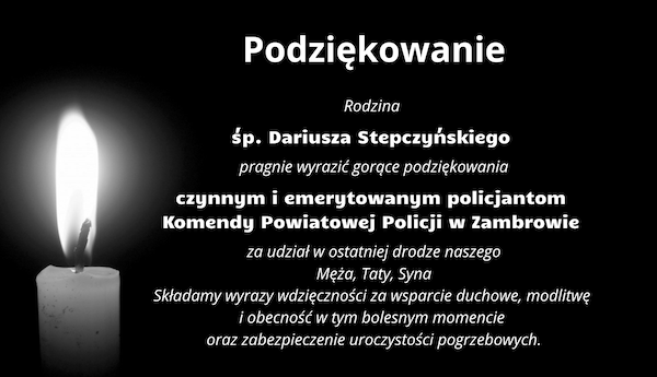 Rodzina śp. Dariusza Stepczyńskiego pragnie wyrazić gorące podziękowania czynnym i emerytowanym policjantom Komendy Powiatowej Policji w Zambrowie za udział w ostatniej drodze naszego