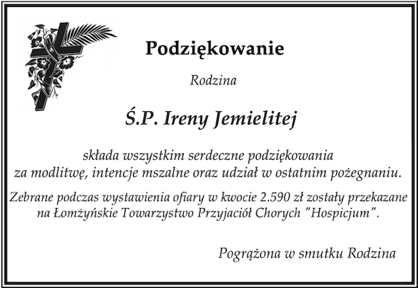 Rodzina Ś.P. Ireny Jemielitej składa wszystkim serdeczne podziękowania za modlitwę, intencje mszalne oraz udział w ostatnim pożegnaniu.