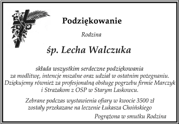 Rodzina śp. Lecha Walczuka składa wszystkim serdeczne podziękowania za modlitwę, intencje mszalne oraz udział w ostatnim pożegnaniu. Dziękujemy również za profesjonalną obsługę pogrzebu firmie Marczyk i Strażakom z OSP w Starym Laskowcu.