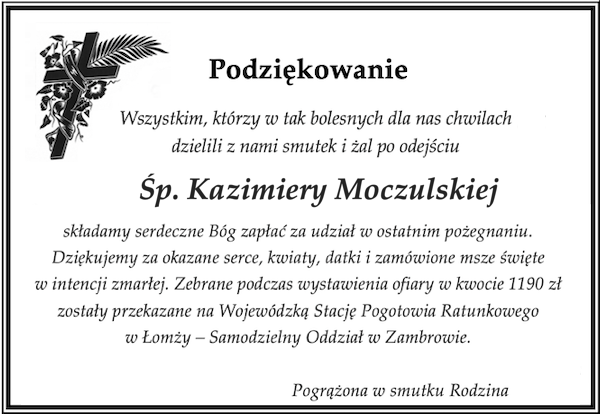 Wszystkim, którzy w tak bolesnych dla nas chwilach dzielili z nami smutek i żal po odejściu śp. Kazimiery Moczulskiej składamy serdeczne Bóg zapłać za udział w ostatnim pożegnaniu.