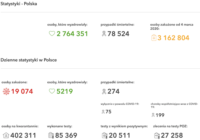 Z powodu COVID-19 zmarło 75 osób, natomiast z powodu współistnienia COVID-19 z innymi schorzeniami zmarło 199 osób. Liczba zakażonych koronawirusem 3 162 804/78 524 (wszystkie pozytywne przypadki/w tym osoby zmarłe).