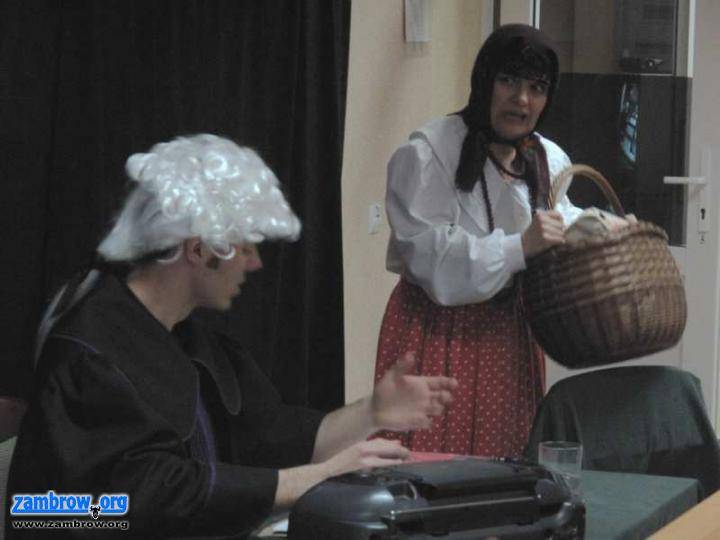 Przedstawienie w Zakładzie Karnym w Czerwonym Borze wystawili artyści z krakowskiego Teatru "Maska": Danuta Okopska w roli Genowefy Bździuch i Piotr Wiśniewski w roli sędziego i Franciszka Bździucha.