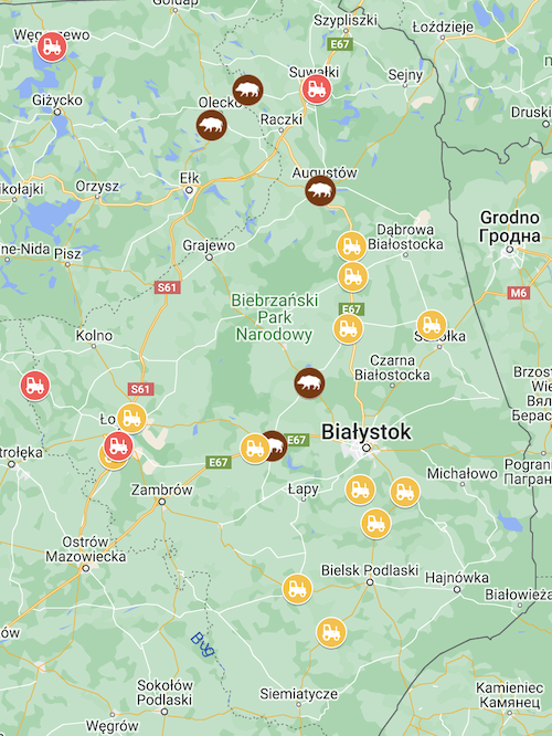 Na DK8 zablokowany jest przez około 200 ciągników węzeł Augustów na wysokości wiaduktu. Z Kobylina ruszyło około 90 traktorów i zmierzają do węzła na S8 w Milewie Zabielnym. Z Żubryna wyjechało około 500 pojazdów.