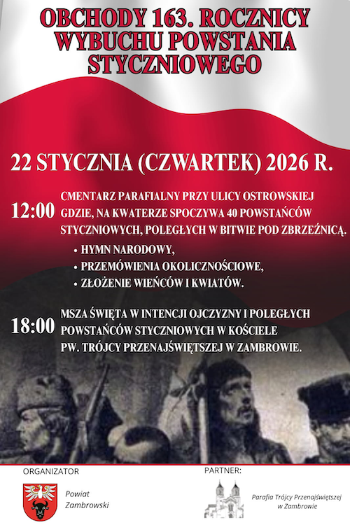 Zapraszamy wszystkich mieszkańców Zambrowa i okolicznych gmin na uroczystość upamiętniającą bohaterów Powstania Styczniowego. Wydarzenie będzie miało miejsce jutro, 22 stycznia na Cmentarzu Parafialnym w Zambrowie - przy grobie Powstańców.