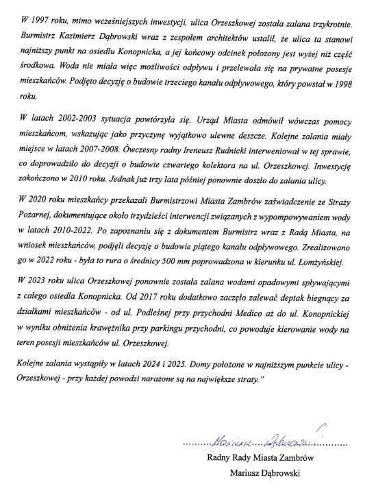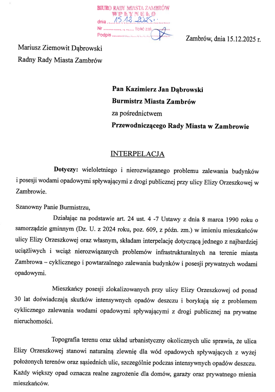 Radny Miasta Zambrów Mariusz Ziemowit Dąbrowski skierował interpelację do burmistrza Kazimierza Dąbrowskiego, która dotyczy wieloletniego i wciąż nierozwiązanego problemu zalewania budynków i posesji przy ulicy Elizy Orzeszkowej w Zambrowie. Mieszkańcy prywatnych nieruchomości od ponad 30 lat doświadczają skutków intensywnych opadów deszczu i borykają się z problemem cyklicznych zalań wodami opadowymi, która spływa z drogi publicznej.