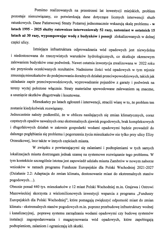 Radny Miasta Zambrów podkreśla, że w związku z nasilającymi się zmianami klimatycznymi, częściej występującymi opadami i ekstremalnymi zjawiskami pogodowymi, brak działań w zakresie gospodarki wodami opadowymi może prowadzić do dalszego pogłębienia się problemu i pogorszenia życia nie tylko mieszkańców z ul. Orzeszkowej, ale także z innych części miasta.
