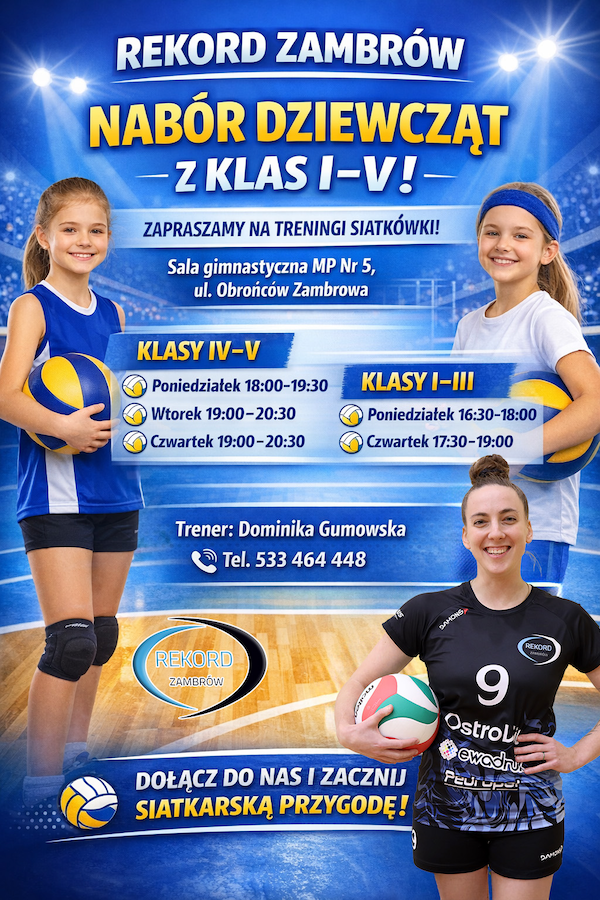 Rekord Zambrów prowadzi nabór uzupełniający dziewcząt z klas I–V szkół podstawowych. Klub zaprasza na regularne treningi siatkarskie, które odbywają się w sali gimnastycznej Miejskiego Przedszkola Nr 5 przy ul. Obrońców Zambrowa.