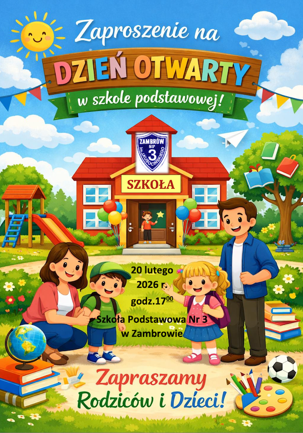 Dyrekcja, nauczyciele oraz uczniowie serdecznie zapraszają wszystkich przyszłych pierwszoklasistów wraz z rodzicami na Dzień Otwarty Szkoły Podstawowej Nr 3 w Zambrowie, który odbędzie się w najbliższy piątek, 20 lutego o godzinie 17:00.