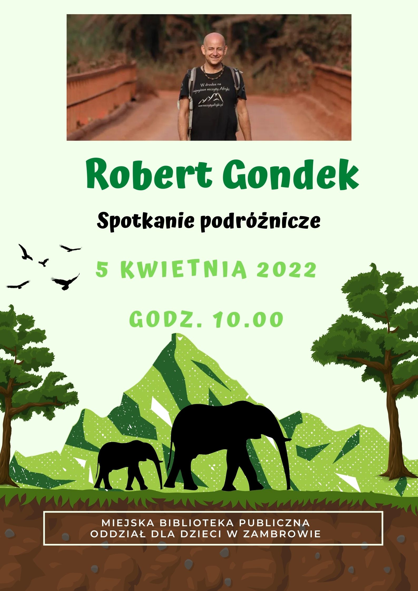 Miejska Biblioteka Publiczna w Zambrowie zaprasza dzieci na spotkanie podróżnicze z Robertem Gondkiem. Wydarzenie odbędzie się 5 kwietnia 2022 r. w Oddziale dla Dzieci o godzinie 10:00.