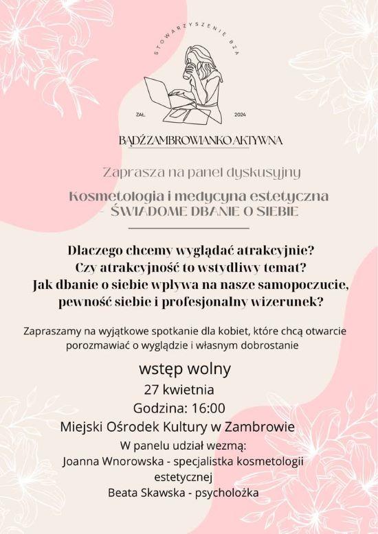 Stowarzyszenie Bądź Zambrowianko Aktywna zaprasza na otwarte spotkanie – panel dyskusyjny dla kobiet i nie tylko. Tematem spotkania będzie “Kosmetologia i medycyna estetyczna - świadome dbanie o siebie”. Podczas panelu przeprowadzona będzie dyskusja o tym, jak dbanie o wygląd wpływa na życie zawodowe i społeczne.
