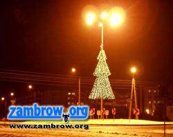 Już od kilku dni wieczorami możemy obserwować, jak na ulicach naszego miasta pojawia się coraz więcej świecących ozdób. Niemalże każda latarnia uliczna wzdłuż ważniejszych ulic w Zambrowie przyozdobiona jest świątecznymi elementami. Na wielu skwerach w mieście, żywe choinki zostały oświetlone przy pomocy różnokolorowych lampek. Na przykład, centrum miasta - Plac Sikorskiego, ozdobiony został przez tysiące światełek malowniczo pozaczepianych na drzewa.Również na najnowszym zambrowskim obiekcie - Miejskiej Pływalni "Delfin", kilka dni temu pojawiły się renifery ciągnące sanie Św. Mikołaja. Natomiast na środku niedawno otwartego ronda, przy wyjeździe w kierunku Białegostoku, mieni się choinka (widoczna na zdjęciu).