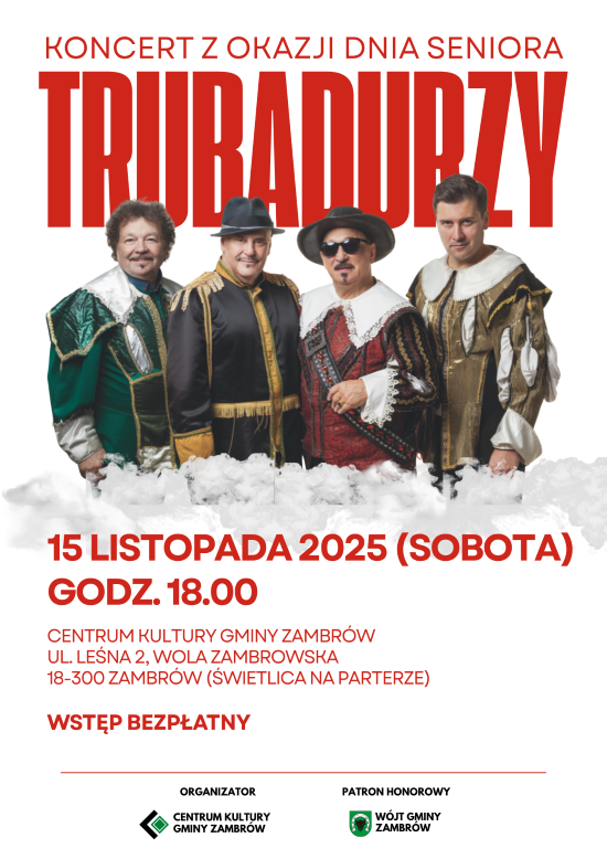 Z okazji obchodów Dnia Seniora w Centrum Kultury Gminy Zambrów odbędzie się koncert zespołu Trubadurzy.