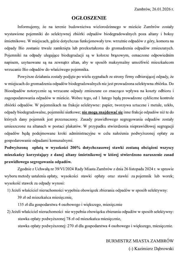 Burmistrz Miasta Zambrów Kazimierz Dąbrowski poinformował o istotnych zmianach w systemie odbioru odpadów biodegradowalnych na terenie zambrowskich osiedli. Od 1 lutego 2026 r. ruszą cykliczne kontrole, a za brak segregacji grożą surowe kary finansowe.