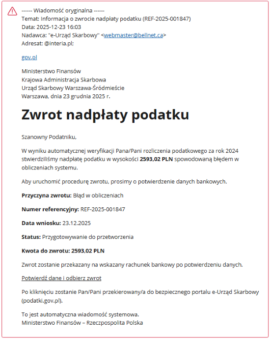 Ministerstwo Finansów i Krajowa Administracja Skarbowa nie wysyłają wiadomości e-mail, informujących o nadpłacie podatku i nakłaniających podatników do potwierdzenia danych identyfikacyjnych lub rachunku bankowego.