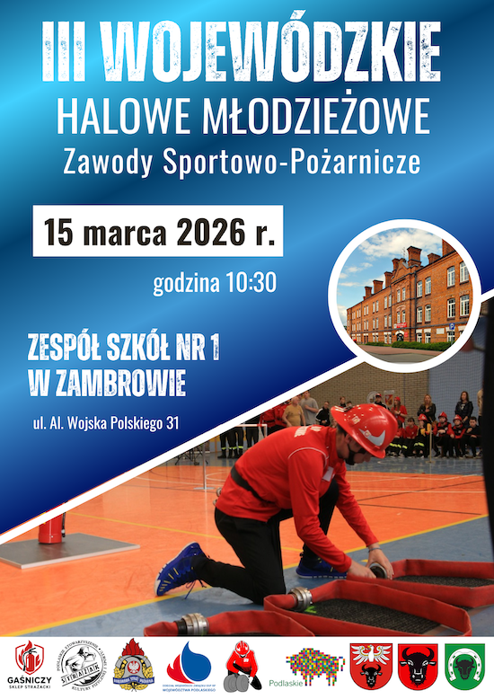 III Wojewódzkie Halowe Młodzieżowe Zawody Sportowo-Pożarnicze odbędą się w niedzielę, 15 marca w hali sportowej Zespołu Szkół nr 1 im. Stefana Roweckiego "Grota" przy Alei Wojska Polskiego 31 w Zambrowie. Patronat nad wydarzeniem objęła starosta Edyta Marchelska-Groszfeld. Impreza promuje sprawność fizyczną i przygotowanie merytoryczne przyszłych ratowników.