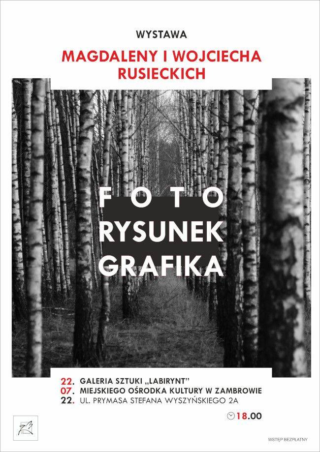 Wernisaż wystawy prac Magdaleny i Wojciecha Rusieckich pod tytułem „Foto, rysunek, grafika” odbędzie się w najbliższy piątek, 22 lipca w Galerii Sztuki „Labirynt” Miejskiego Ośrodka Kultury w Zambrowie przy ulicy Prymasa Stefana Wyszyńskiego 2a.