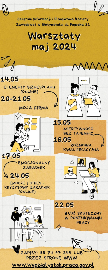 Poniżej przedstawiamy harmonogram warsztatów, które w maju 2024 r. organizuje Centrum Informacji i Planowania Kariery Zawodowej Wojewódzkiego Urzędu Pracy w Białymstoku. Szkolenia skierowane są do dorosłych mieszkańców województwa podlaskiego, zainteresowanych własnym rozwojem zawodowym.