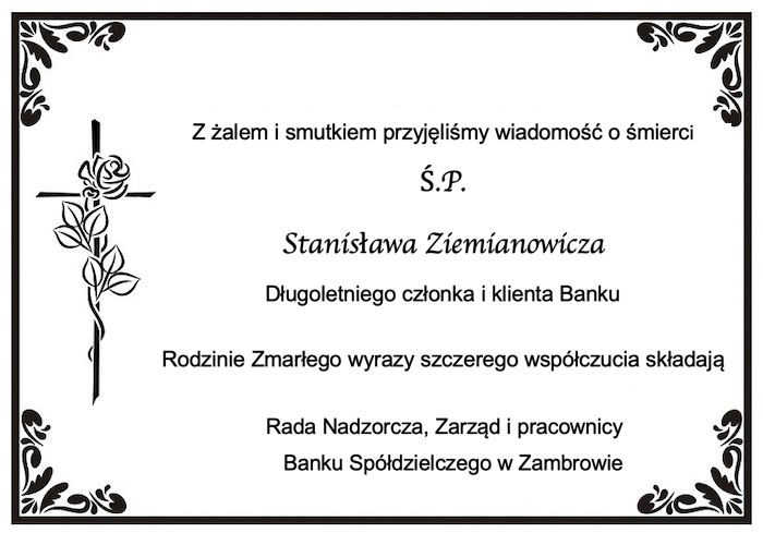 Rada Nadzorcza, Zarząd i pracownicy Banku Spółdzielczego w Zambrowie składają wyrazy szczerego współczucia Rodzinie Zmarłego - Ś.P. Stanisława Ziemianowicza - długoletniego członka i klienta Banku.