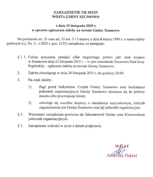 Wójt Gminy Szumowo Andrzej Pskiet wydał zarządzenie w sprawie ogłoszenia żałoby na terenie gminy Szumowo celem uczczenia pamięci ofiar tragicznego pożaru, jaki miał miejsce w Szumowie w minioną sobotę, 22 listopada [LINK]. W wyniku pożaru zginęła mieszkanka Szumowa pani Irena Rupińska i jej 2-letni wnuczek.