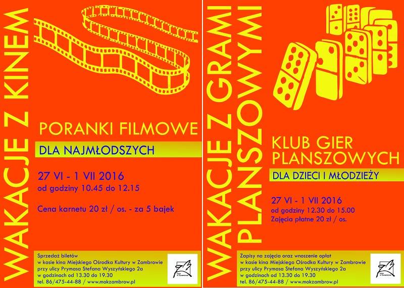 Miejski Ośrodek Kultury w Zambrowie przygotował bardzo ciekawe propozycje wakacyjne dla dzieci, młodzieży i osób dorosłych. Każdy znajdzie coś dla siebie: zajęcia plastyczne, poranki filmowe dla najmłodszych, bezpłatne lekcje języka angielskiego lub gry planszowe. Poniżej przedstawiamy szczegółowy harmonogram propozycji Miejskiego Ośrodka Kultury w Zambrowie.