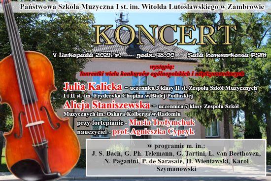 Państwowa Szkoła Muzyczna I st. im. Witolda Lutosławskiego w Zambrowie zaprasza na koncert skrzypcowy w wykonaniu uczennic prof. Agnieszki Cypryk, które są laureatkami wielu konkursów ogólnopolskich i międzynarodowych.
