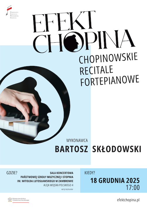 Koncert zatytułowany „Efekt Chopina” w wykonaniu Bartosza Skłodowskiego będzie miał miejsce 18 grudnia w Państwowej Szkole Muzycznej I st. im. Witolda Lutosławskiego w Zambrowie. Wydarzenie odbędzie się w ramach cyklu Chopinowskich Recitali Fortepianowych organizowanych przez Narodowy Instytut Fryderyka Chopina.