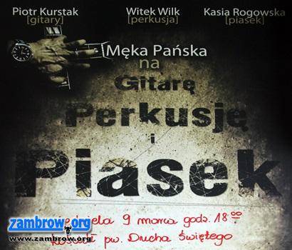 "Męka Pańska na gitarę, perkusję i piasek" to projekt realizowany z wielkim rozmachem przez trójkę artystów z Białegostoku i Warszawy: Piotra Kurstaka, Witka Wilka i Kasi Rogowskiej. W Zambrowie artyści zaprezentują się jutro, 9 marca w parafii pw. Ducha Świętego.